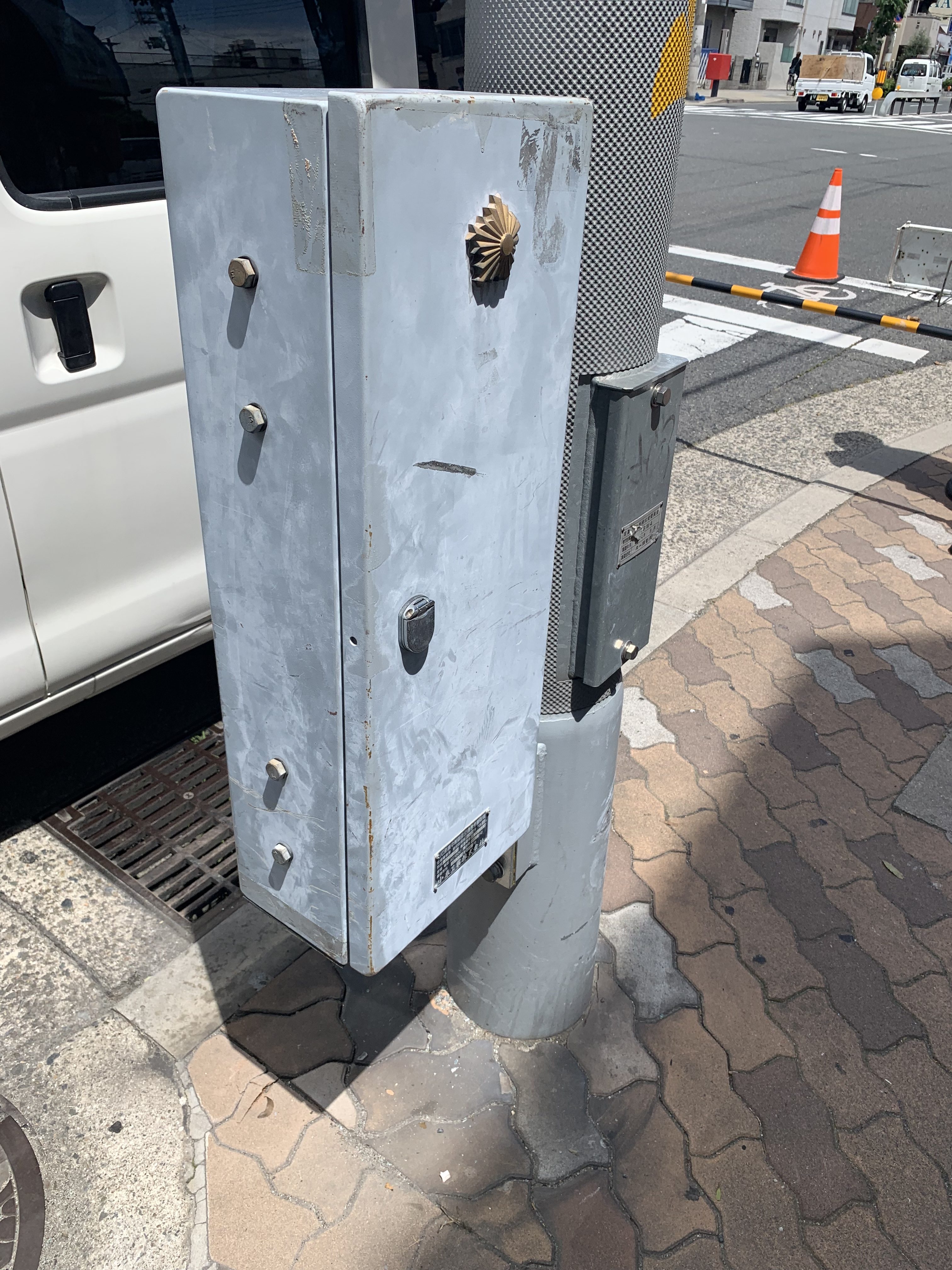 交通信号機工事(事故等の復旧工事) 交通事故などで信号機灯器や信号柱などの破損や障害が発生時に緊急対応工事をしています 今回は信号機を動かしている制御盤の支えている部分が破損しているための取替工事をしてきました